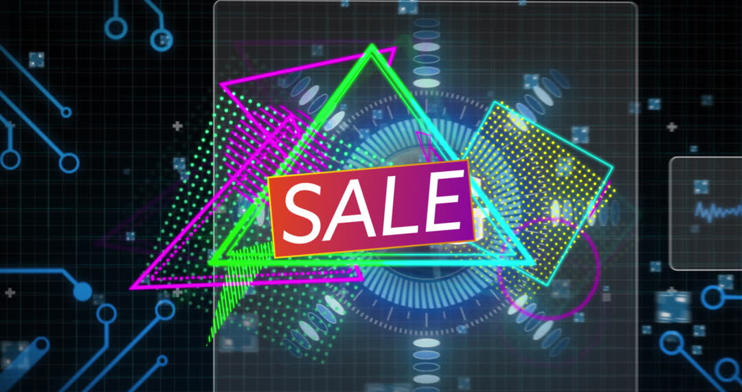 Dynamic visualization showcasing the word “SALE” highlighted with vibrant neon-colored geometric shapes against a digital, technological background. Ideal for digital marketing campaigns, online sales promotions, tech-themed advertisements, and engaging web content emphasizing sales events.