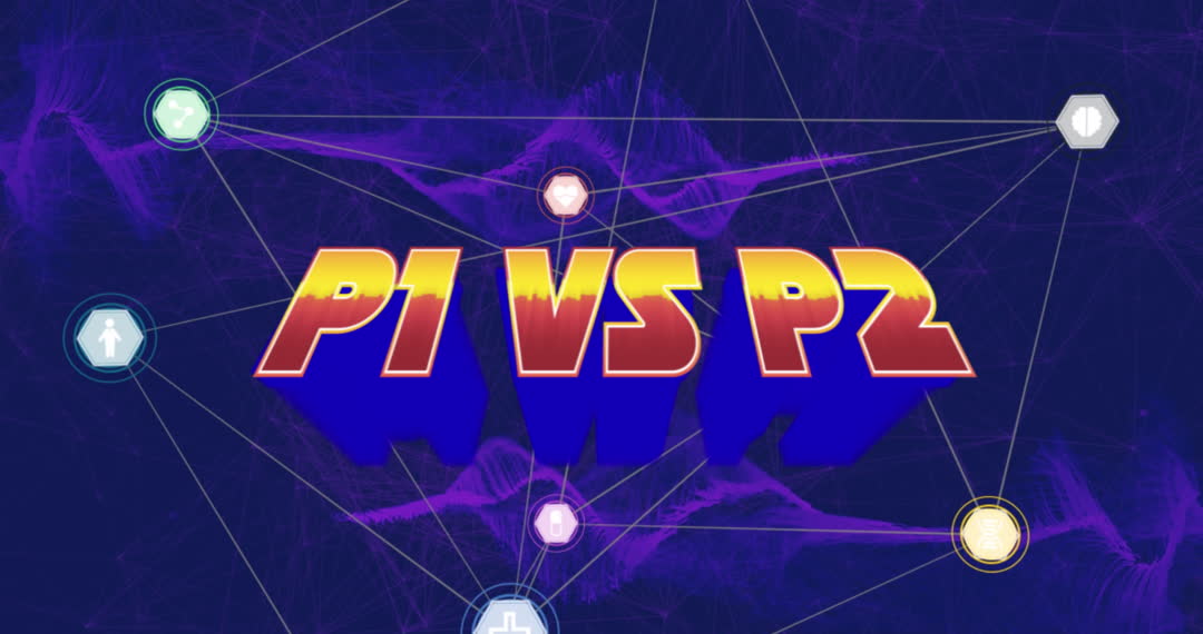 Vibrant digital animation highlighting a competition theme with P1 versus P2 text at the center. The interconnected icons and network lines suggest an advanced technological concept resembling a virtual battleground or online gaming interface. Design features colorful hexagonal icons amidst abstract geometric patterns for an immersive, modern feel. Suitable for technology blogs, esports event promotions, presentations on digital innovation, or online platform branding.
