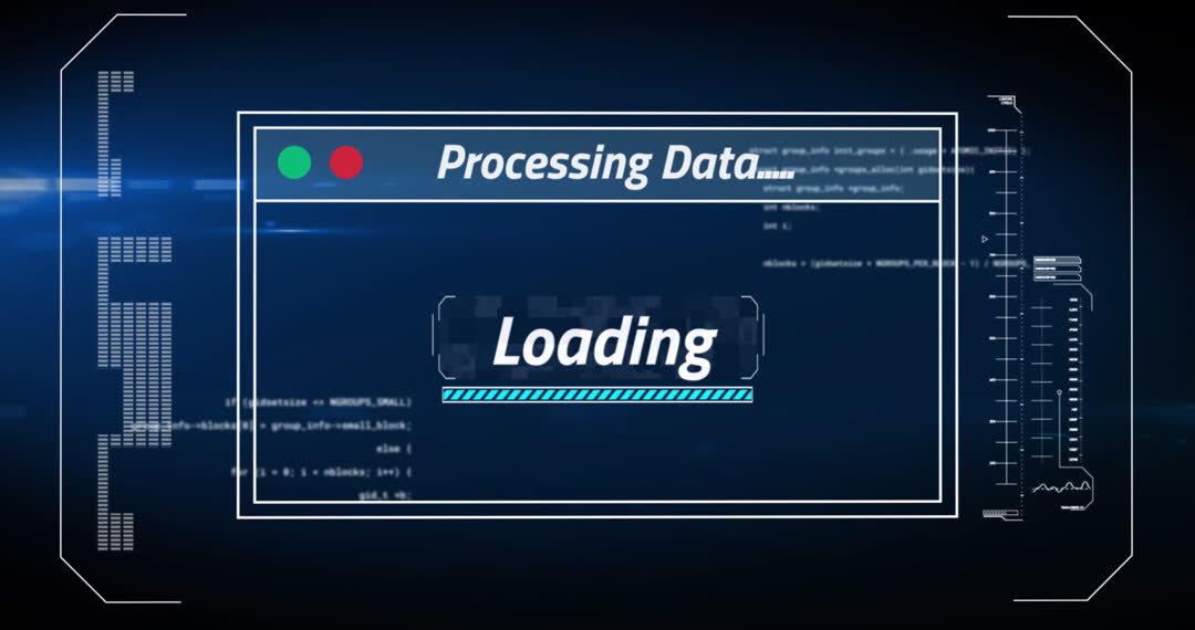 Design includes modern digital interface, highlighting a data processing progress. Useful for presentations about computing technology, IT solutions, or innovative data management strategies. Serves as a visually engaging element for explaining complex tech processes.