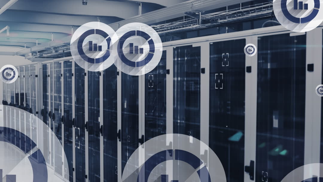 Image shows a modern server room with virtual data visualization symbols overlayed, illustrating advanced technology environments. Suitable for use in technology blogs, articles on digital infrastructure, and promotional material for IT services highlighting secure and innovative tech solutions.