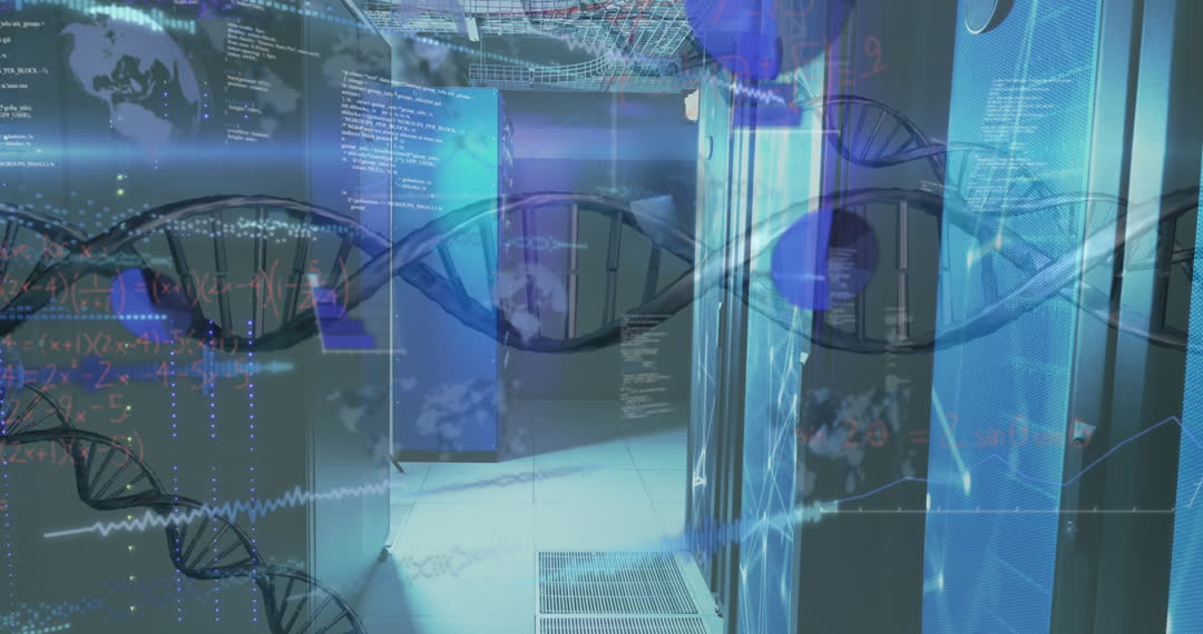 Image depicts a modern server room overlaid with digital animations of a DNA strand and data processing visuals. This conveys the integration of genetic research with cutting-edge technology and computing. Useful for topics on tech innovation, biotechnology, or digital interface design.