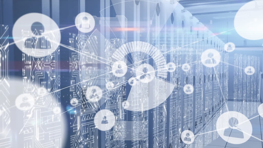 This visual scene of a server room combined with digital networking icons exemplifies futuristic communication and technology concepts. It is suitable for use in presentations, articles, or websites focusing on advancements in IT infrastructure, data centers, and innovation in digital communication.