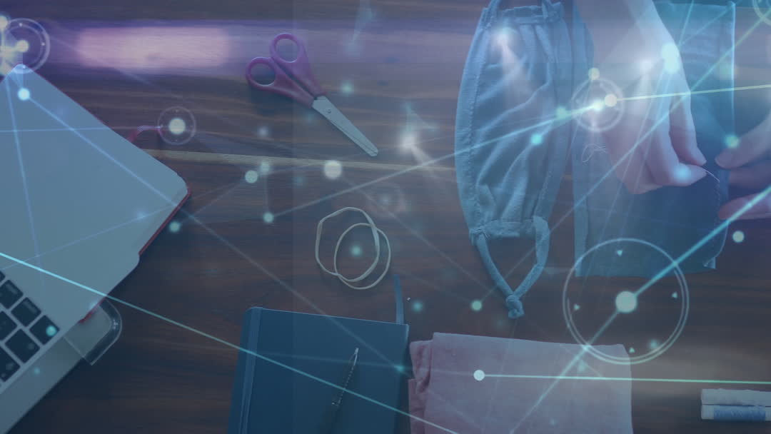 Animation showcases the fusion of sewing and technology, illustrating data overlaying hands working with fabric. Perfect for use in promoting textile workshops, fashion technology advancements, or digital craft solutions. Demonstrates innovative approach to traditional handcrafts transformed by modern technology.