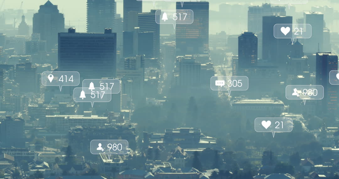 Cityscape featuring digital icons symbolizing social media notifications, indicating global digital communication. Perfect for topics related to smart cities, digital transformation, or social media engagement. Useful for visualizing global connections and modern urban information exchange.