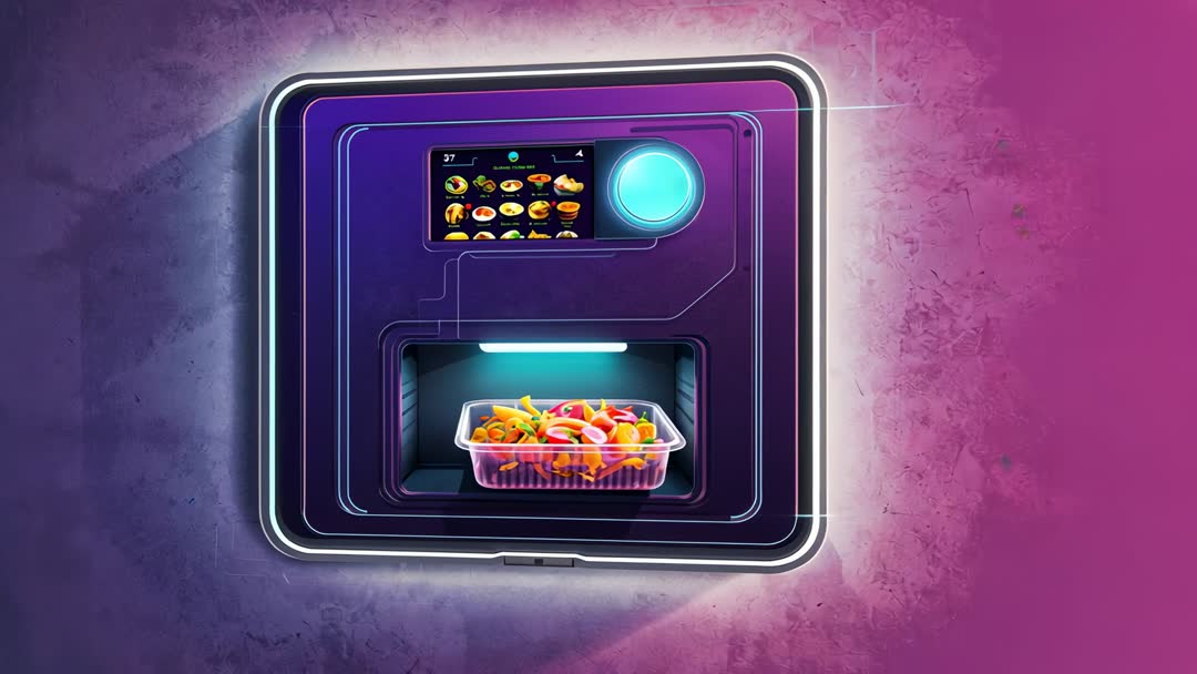 AI Generated Image. Video showing wall-mounted smart food dispenser being revealed by zooming camera, highlighting touchscreen menu and illuminated pickup tray. Close-up sequence focusing on digital menu icons, circular control dial, and transparent meal container with colorful salad. Neon gradient background and beveled frame creating futuristic retail or hospitality vibe. Serving tech product demos, restaurant automation campaigns, vending machine marketing, and investor presentations. Suggesting usage as short social media clip for product launch, hero banner for food tech website, background loop for trade show booth, tutorial clip for contactless pickup workflow, and promotional ad for automated kitchen solutions. Recommending edits such as adding logo reveal, overlaying call-to-action text, using speed ramp for dramatic reveal, and creating loopable segment for kiosk display. Encouraging color grading toward magenta and cyan palettes to emphasize neon aesthetic. Noting suitability for commercial licensing in advertising, product marketing, and editorial features.