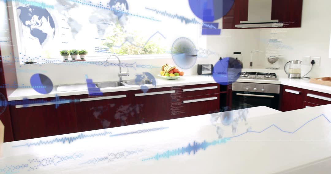Video showing modern kitchen interior with translucent blue data visualizations overlaying scene, world map nodes, waveform graphs, and circular UI elements sweeping across countertop and cabinets. Digital overlays interacting with appliances and sink area, suggesting sensor feeds, energy usage, inventory tracking. Featuring clean minimalist motion language, bright natural light and deep wood cabinetry providing contrast. Offering edit-friendly composition with space for logo, headline, lower-third text. Color palette favoring white surfaces and blue data accents for easy color grading. Recommended for smart home product demos, IoT platform presentations, appliance marketing, technology commercials, corporate pitch decks, website hero banners, explainer videos, social media promos, and UX concept visualization.