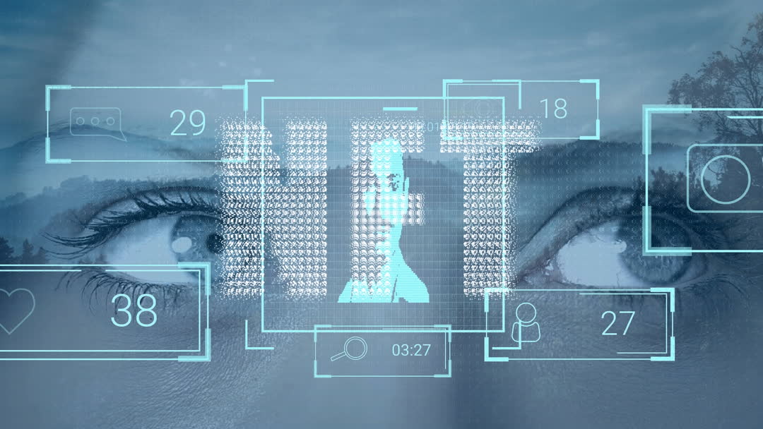 This depiction of a social media and technology interface overlay on human eyes highlights themes of digital interaction, biometric data scanning, and connectivity. Useful for illustrating concepts related to future technologies, the impact of social media, or innovative digital landscapes.