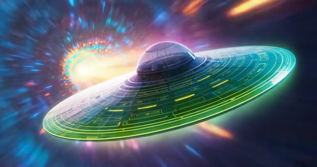 AI Generated Image. This visual depicts a disc-shaped futuristic spacecraft maneuvering through a warp speed tunnel, highlighting the vibrant neon green undercarriage as it accelerates through space. Ideal for sci-fi enthusiasts, video games, or films focusing on technology and space exploration concepts.