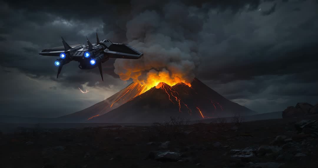 - Futuristic Spacecraft Navigating Erupting Lava Volcano