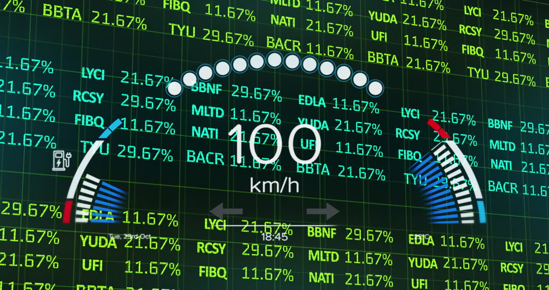 This video shows a high-tech dashboard interface featuring a speedometer combined with an overlay of financial data and numbers. It symbolizes the integration of technology with financial analytics suggesting the speed and impact of market changes globally. This concept can be ideal for marketing material about financial technology products, innovations in trading applications, or visual illustrates in financial reports about market dynamics, globalization or high-speed data.