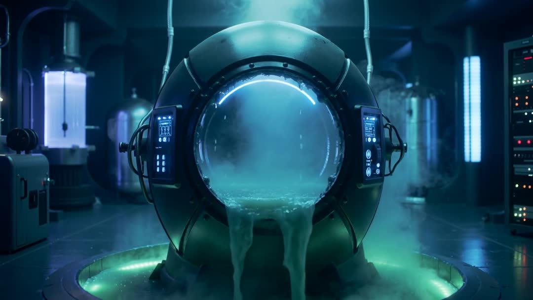 AI Generated Image. Video clip showing futuristic spherical pod draining teal liquid into glowing lab sump, control panels displaying diagnostic data. Scene featuring moody blue-green lighting, swirling vapor, soft reflections on metallic surfaces, high-tech equipment in background. Ideal for illustrating experimental procedure, depicting containment breach, enhancing sci-fi trailers, supporting technology promos, enriching biotech presentations. Suitable for overlays, background footage, title sequences, looped visuals for exhibitions or gallery displays. Offering clean composition and strong central focal point, enabling easy cropping and color grading for branding and editorial use.