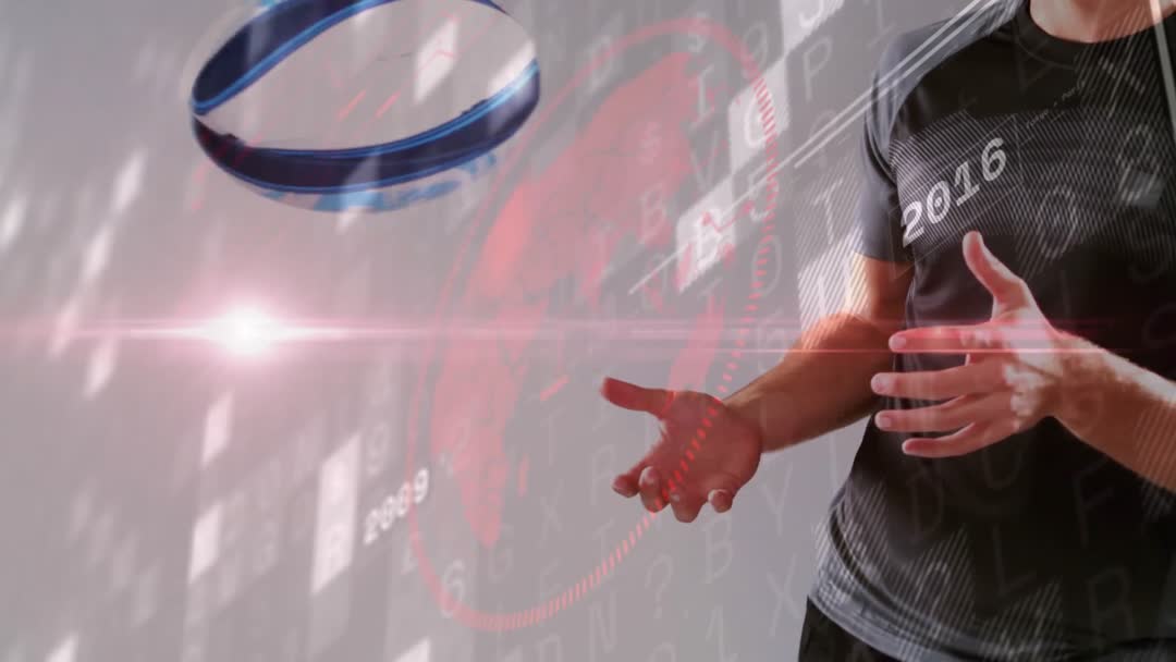 This video creatively illustrates sports analytics and technological innovation through digital visuals of data and timeline markers. The shot of a man catching a sports ball with digital effects and highlighted dates symbolizes progress and interactive analysis in modern fitness regimes. Perfect for presentations on athletic innovation, fitness technology promotions, and data-driven sports training solutions.