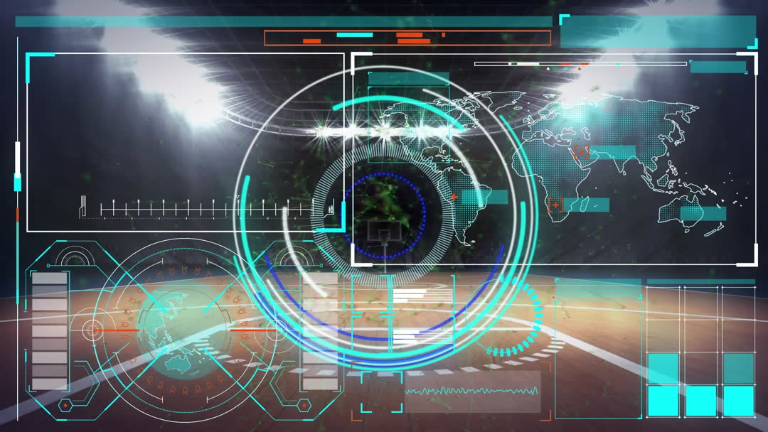 Digitally enhanced view of a sports stadium featuring high-tech data interfaces and visual effects suggesting technological advancements in sports analytics. This futuristic display offers a global connection theme with maps and data processing elements. Ideal for use in promotions related to sports technology, innovations in data analysis during competitions, or highlighting advancements in augmented reality sports broadcasts.