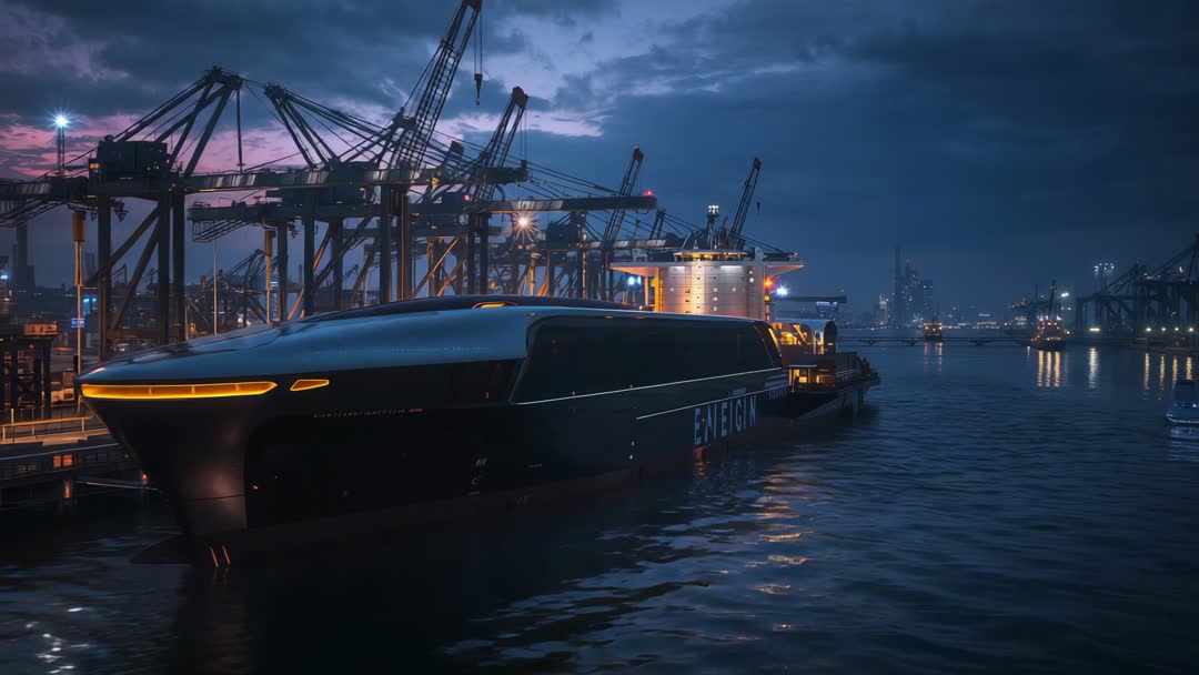 AI Generated Image. Video clip showing futuristic superyacht gliding along industrial quay at dusk, amber bow lights tracing smooth reflections on calm water. Crane silhouettes and container terminals framing vessel, while distant city skyline glowing under stormy clouds. Close-up sequences featuring sleek hull lines, illuminated deck details, and tugboat maneuvering alongside for scale. Visual tone blending cinematic noir with modern maritime technology, suitable for high-end branding and concept demonstrations. Usage suggestions: - Using as hero background for yacht builder or luxury marine brand presentations - Using as B-roll in corporate videos about shipping, port infrastructure, or urban waterfront development - Using as opener in tech or design documentaries exploring futuristic transport concepts - Using as visual asset for website headers, social media campaigns, and poster art for events - Using as stock footage in film, TV, or advertising requiring moody nocturnal harbor atmosphere File notes: - Wide cinematic composition offering negative space for text overlay and lower third placement - Color palette featuring deep navy blues and warm amber highlights, matching modern branding themes