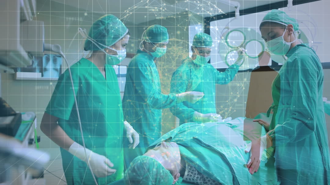 Illustrating modern medical practice with advanced technology, this video features a diverse surgical team performing in an operating room. The digital overlay with connections and a globe highlights the integration of technology into healthcare, suggesting advanced techniques and global collaboration. Useful for content on medical advancements, digital health solutions, and innovation in surgery.