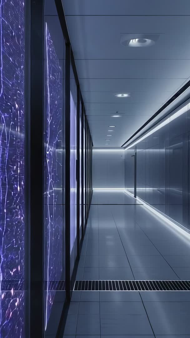 - Futuristic tech corridor traveling shot with pulsing LED panels and sleek digital walls