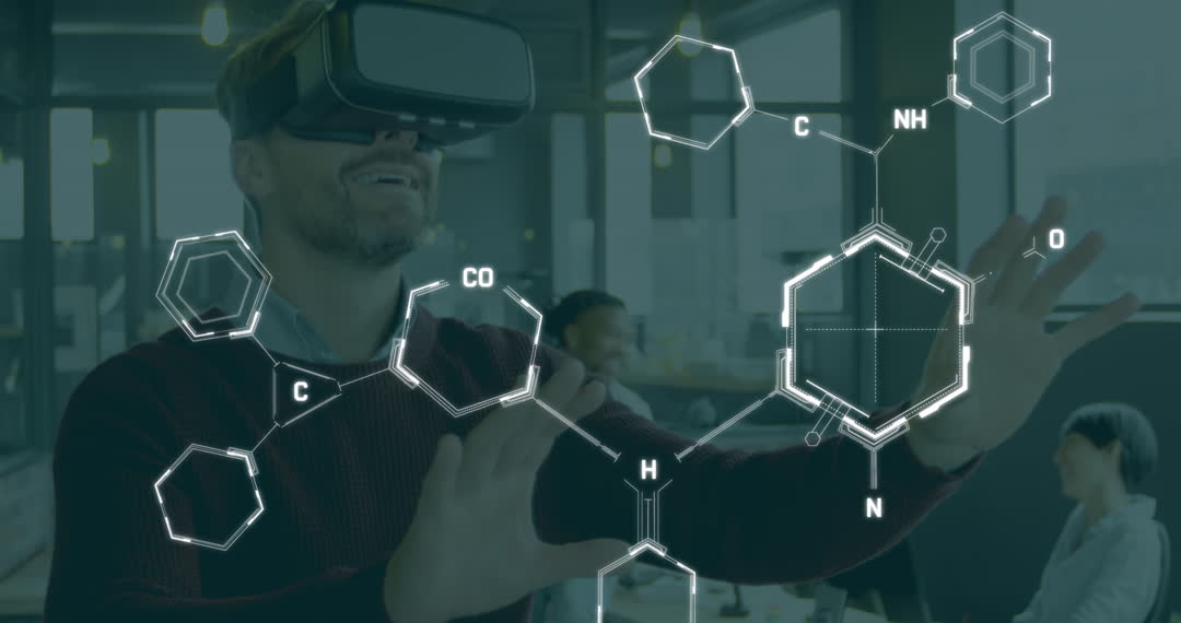 Scene showcases a caucasian man interacting with a virtual reality headset against a backdrop of digital chemical formulas. It highlights the fusion of virtual reality technology and scientific exploration. Ideal for illustrating advancements in educational technology, innovative scientific research, or the future of interactive learning experiences.