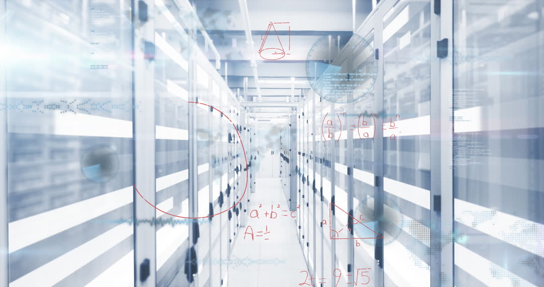 Futuristic data center featuring a digital overlay of mathematical equations and technological interface elements. This visual is ideal for illustrating concepts of digital transformation, network security, and technological advancements in tech blogs, educational materials, or corporate presentations focusing on IT solutions.