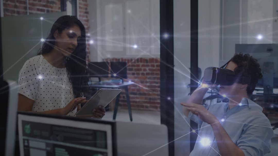 Depicts a technology environment where a woman interacts using a tablet next to a man experiencing virtual reality. Occurrence of network lines symbolizes data connectivity and future-focused teamwork. Ideal for illustrating themes of digital innovation, tech-driven workplaces, educational materials about advancements in virtual reality, or business presentations highlighting collaboration in modern settings.