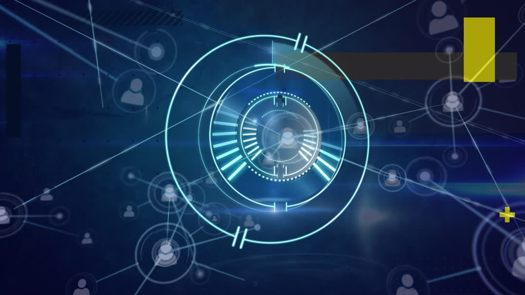 Neon round scanner with overlaid network connections depicting advanced technology themes. User profile icons suggest connectivity and global network communications. Useful for illustrating concepts of digital innovation, modern networking, data analysis, and high-tech interfaces in presentations, reports, and digital media content.