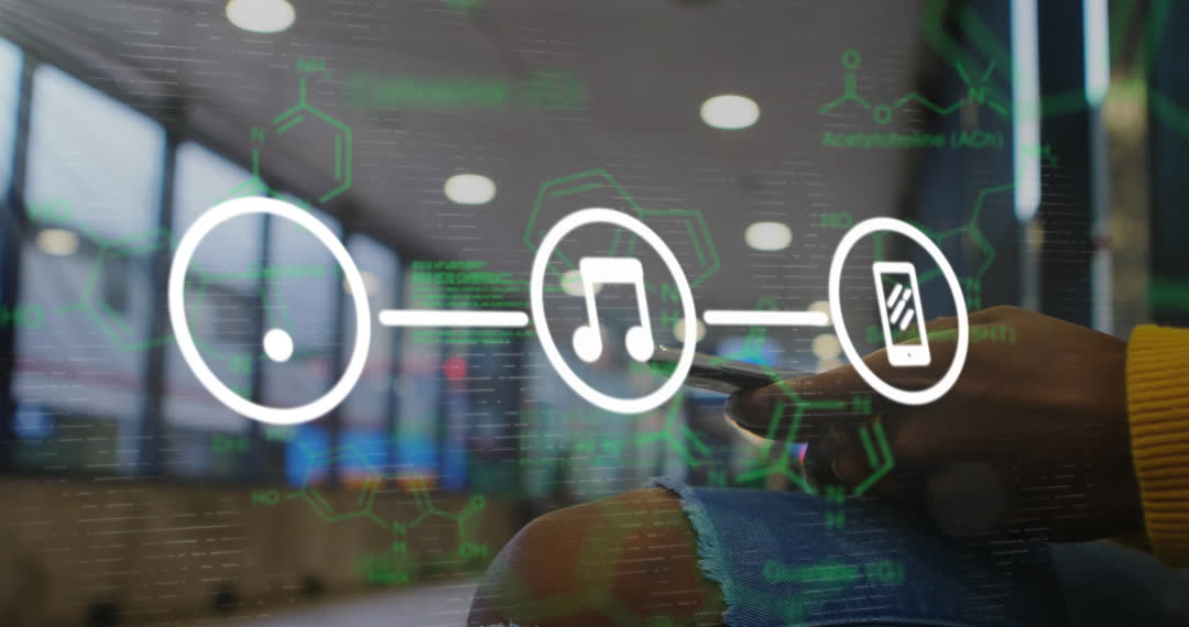 Visual represents integration of modern technology and data science, featuring hand using smartphone with digital icons overlay. Ideal for illustrating concepts of data processing, communication technology, innovation in tech environments, and futuristic advancements. Useful for tech promotional materials, educational content on digital connectivity, and science communication.