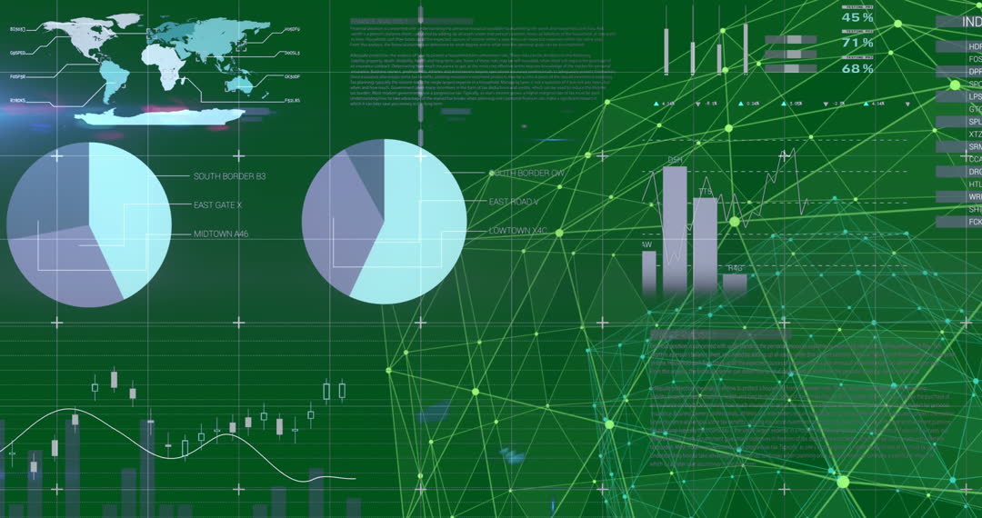 Illustrates a modern digital interface with a globe of connected dots rotating over various data charts and graphs. Ideal for presentations on technology advancements, global finance, database management and strategy development in enhanced visual formats. Useful for reports, investment insights and educational purposes to portray complex data in an engaging way.