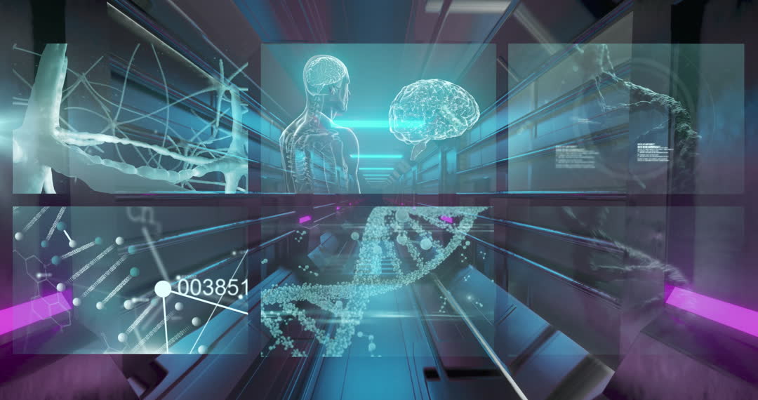 Dynamic representation of advanced technology using digital interfaces and global data networking visuals. Showcases elements like AI networks, brain illustrations, and DNA, portraying a seamless virtual environment ideal for enhancing content related to science, technology, innovative research, and digital transformation initiatives. Valuable for use in presentations, educational materials, and tech-focused media.