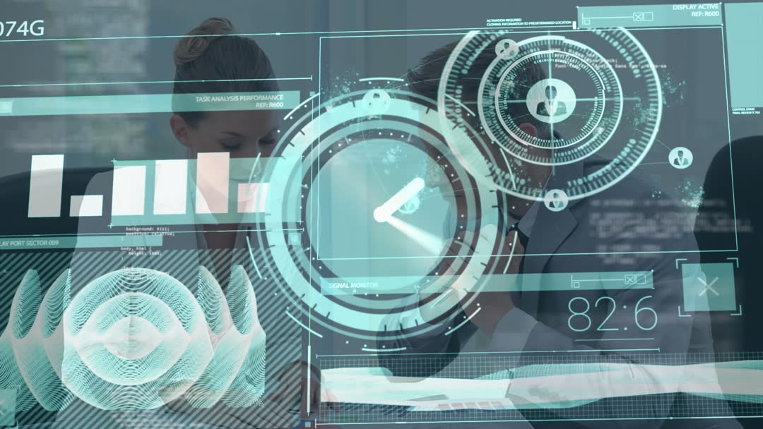 Futuristic Technology Data Interface with Business Professionals Overlay Video