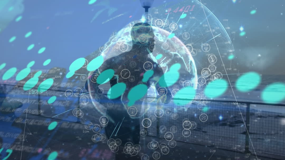 A visual synthesis of a futuristic theme combined with physical activity, depicting a spinning globe overlay on an African American man running on a promenade. Light trails signify energy, speed, and connectivity, making this suitable for projects related to futuristic technology, health innovations, or modern networked lifestyles. Useful in tech, fitness promotion, or digital marketing materials emphasizing active living.