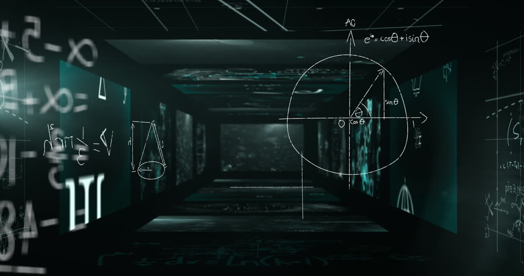 Digital animation showcasing intricate mathematical equations and data processing in a high-tech environment, emphasizing futuristic technology and computer science applications such as algorithms and neural networks. Suitable for content related to innovation in tech fields, educational videos, and visuals for technology presentations or science fiction themes.