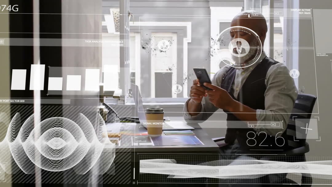 Digital composite showcasing an African American man interacting with technology in a modern office. Abstract interfaces and data overlays suggest advanced data analytics, modern business practices, and tech innovation, suitable for content on digital transformation, office productivity, or future-oriented business strategies.