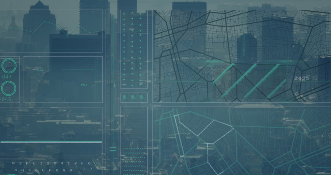 Depicts a futuristic digital interface superimposed over a cityscape. Ideal for illustrating concepts of technology integration, smart cities, urban planning, and innovation. Suitable for use in tech-related articles, presentations, or marketing materials featuring modern business solutions.