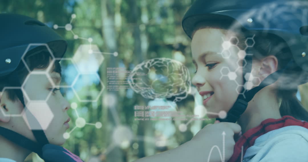 Children wearing helmets visible through transparent overlays of futuristic technology, highlighting a digital brain, implying an intersection of play and innovation. Use this for concepts about high technology in outdoor play, educational advancements, or promotional materials featuring youth technology engagement.