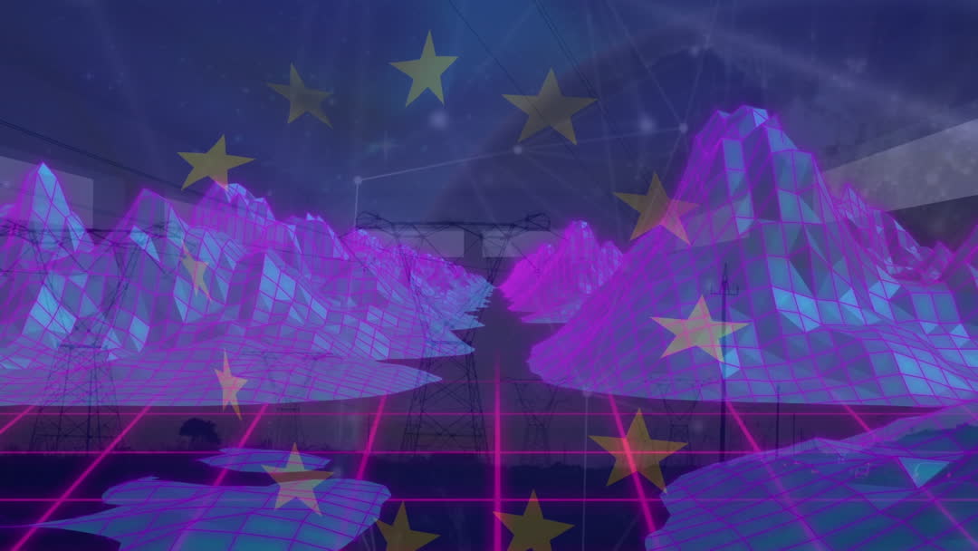 Vibrant digital landscape featuring the European Union flag draped over a neon grid. Highlights concept of advanced technology and digital transformation in Europe. Ideal for illustrating EU's role in global technology markets, digital economy, or virtual reality developments.