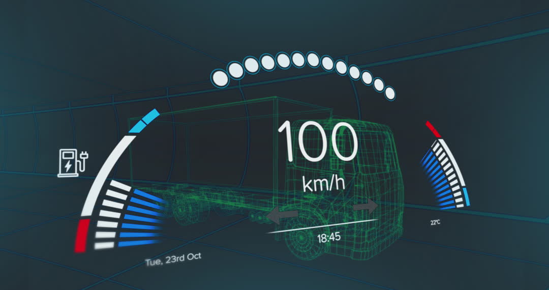 - Futuristic Truck Dashboard Display with Speedometer and Power Levels