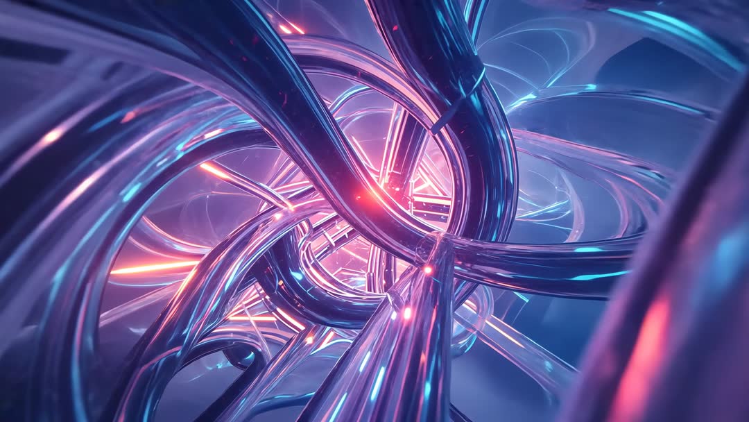 AI Generated Image. Dynamic visual of intertwining metallic tubes leading towards a glowing neon pink core. The animation exhibits drifting blue particles creating an immersive, technological atmosphere. This video is suited for projects related to sci-fi themes, innovative projects, AI development concepts, and futuristic presentations.