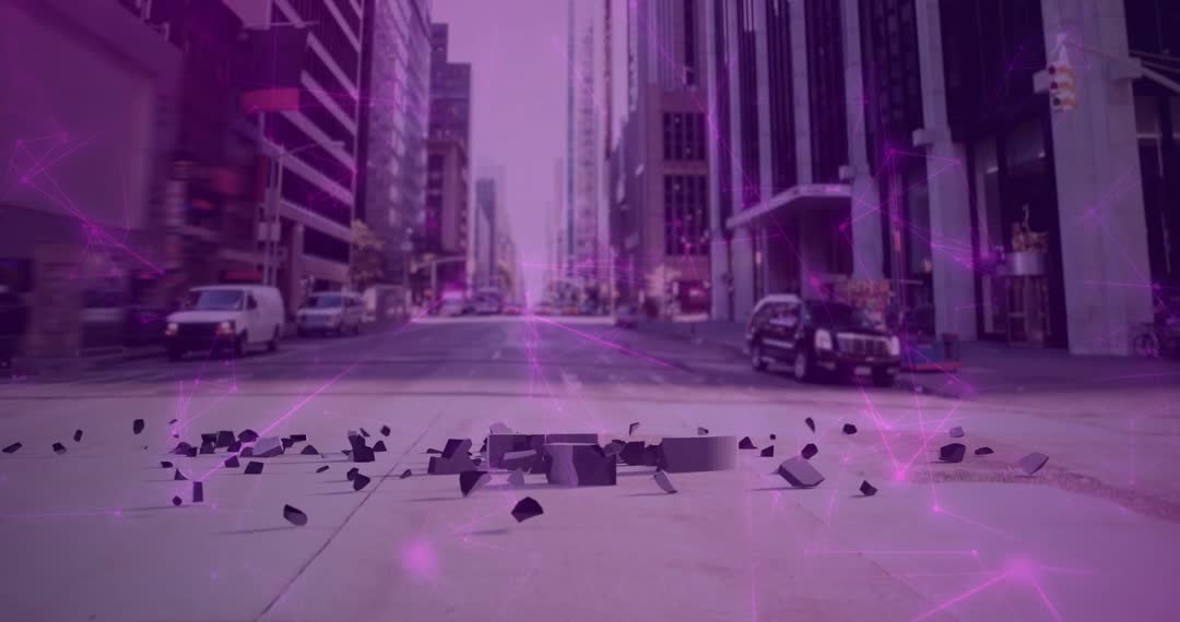 Depiction of a city street entwined with digital, purple network animation creating a sense of futurism and technological interface. Bits of debris scattered add a layer of urban realism, symbolizing technological intertwining with human environments. Ideal for projects emphasizing future tech influences or metropolitan technology themes, offering visually engaging material for innovation or cyberspace-themed presentations.