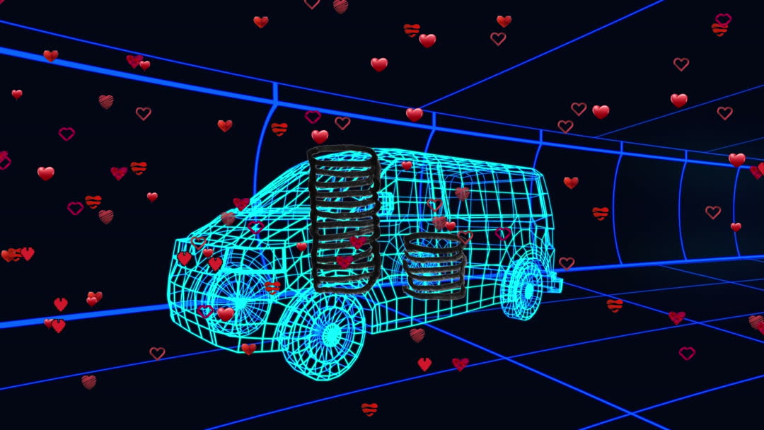 Futuristic depiction of a van in a wireframe style surrounded by network connections and floating heart graphics. Ideal for use in technology presentations, digital architecture, vehicle design concepts, or marketing materials highlighting innovation and global connectivity.