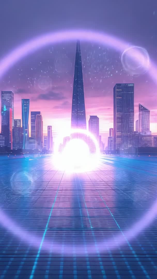 AI Generated Image. Vertical video presenting pulsing white energy core resting on glowing grid platform, emitting concentric neon rings and drifting particle field while forming translucent portal before towering futuristic skyline with central spire and pastel purple-pink sunset. Foreground grid reflecting neon blue trails, camera pull and subtle lens flares creating immersive depth and cinematic motion. Suitable for loopable backgrounds, VJ projections, event openers, app intros, social media reels, title sequences, product launches and technology presentations. Suggested uses include overlaying bold headline text in upper third, combining with synthwave audio for retro-futuristic mood, adjusting color grade to match brand palette and exporting as vertical 9:16 video for mobile-first campaigns.