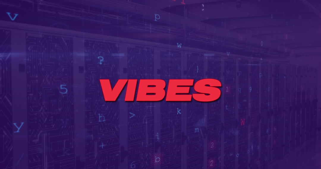 This visual features bold 'VIBES' text superimposed on a digital rendering of a server room. Blending elements suggest the dynamic transition of social media and global information exchange. Utilizes vibrant blues for a modern tech aesthetic. Perfect for presentations on data technology, promotional content for tech firms, or digital media campaigns highlighting cutting-edge innovation.