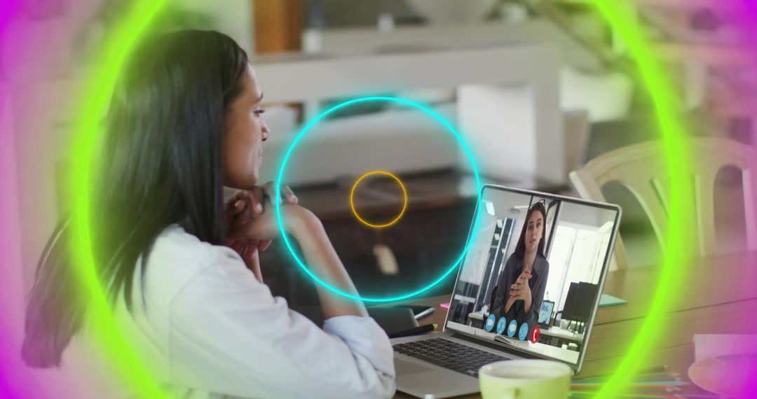 Modern professional engaged in an online business meeting, where pulsing neon rings signify dynamic digital engagement. Perfect for illustrating the intersection of contemporary communication tools and workplace dynamics. Useful for educational content on video conferencing innovations or promotional material for digital communication software.