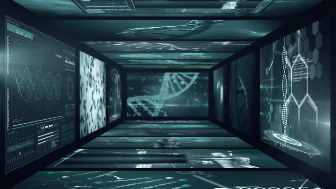 A high-tech virtual environment showcasing digital data interfaces and holographic displays with DNA sequences. This can be used to illustrate themes of technological innovation, scientific research, biotechnology advancements, or digital data processing in presentations, posters, or educational materials.