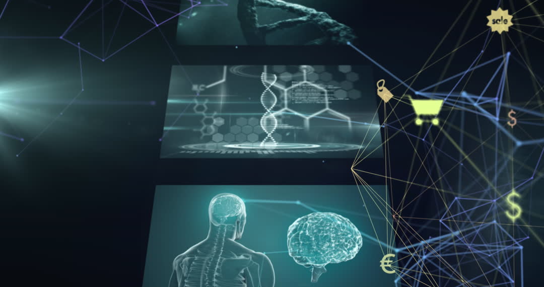 This illustration showcases a conceptual network of digital data and connections. Elements such as DNA sequences, human anatomy, and abstract geometric shapes suggest themes of technology, science, and digital communication. Perfect for representing cutting-edge research, genetics, biotechnology, and the integration of technology in healthcare or big data analytics. Usage in marketing materials, websites, or presentations that focus on innovation and technological advancements would be ideal.