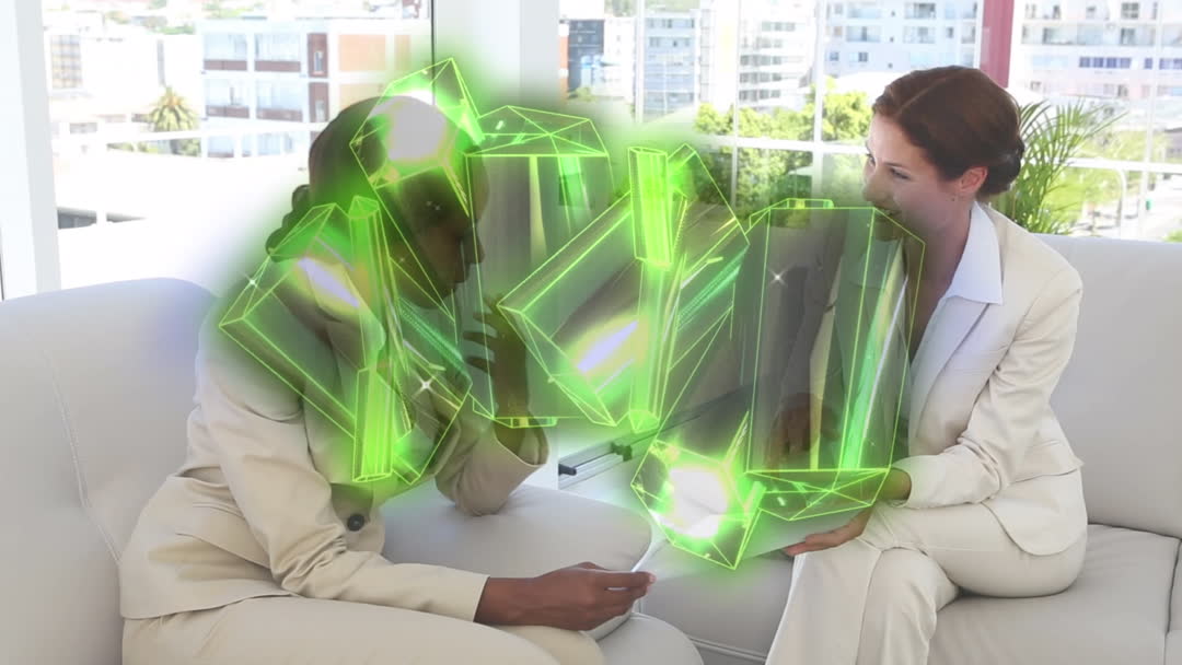 Businesswomen are collaborating using a futuristic virtual reality interface in a modern office environment. The green digital blocks add an element of high-tech and data analysis, depicting innovation and technology integration in professional settings. Useful for showcasing advancements in modern business technology, digital innovation in workplaces, and virtual reality applications in corporate sectors.