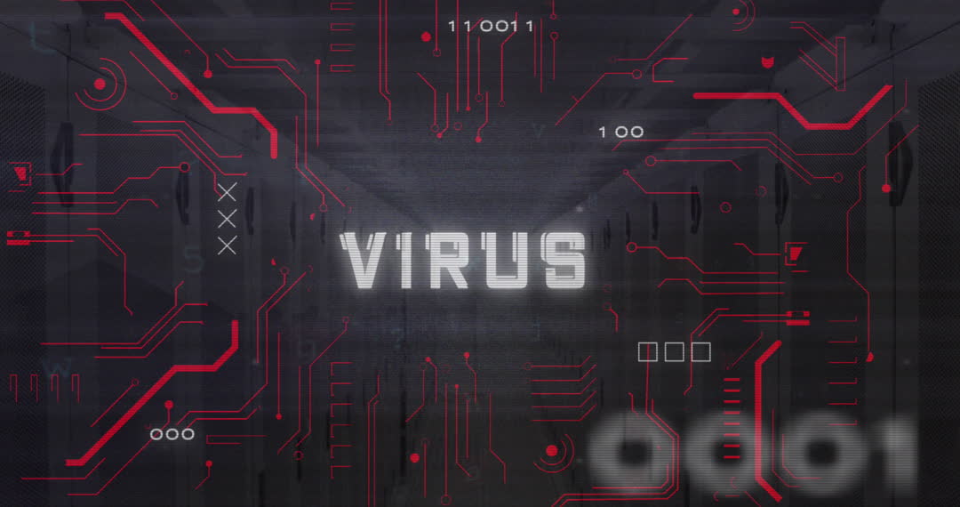 Depiction of a digital interface warning about a computer virus amid complex circuitry animations. Viral alerts and network security concepts shown with electronic and code elements. Useful for illustrating cybersecurity threats and digital protocol themes in articles or presentations related to IT security systems, hacking scenarios, or data protection awareness.