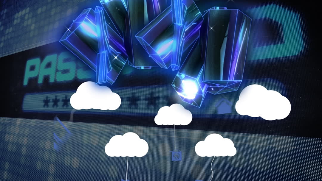This concept involves an animation showcasing advanced data encryption with glowing 3D shapes symbolizing secure digital data processes paralleled by digital clouds indicating cloud computing. Ideal for illustrating topics related to cyber security, data protection, and technology innovation in digital marketing campaigns, educational materials on network security, and tech conferences relating to secure IT services.