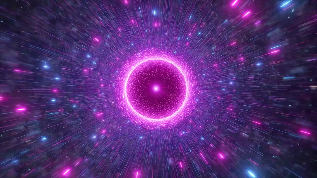 AI Generated Image. The video displays a sci-fi-inspired warp tunnel where a glowing magenta core releases vibrant pink and blue streaks of energy, creating a dynamic and futuristic scene. This visualization can be used in multimedia projects related to technology, science fiction themes, energy concepts, and digital art. The vivid colors and sense of motion make it ideal for intros, backgrounds, or as a visual metaphor for innovation and high energy.