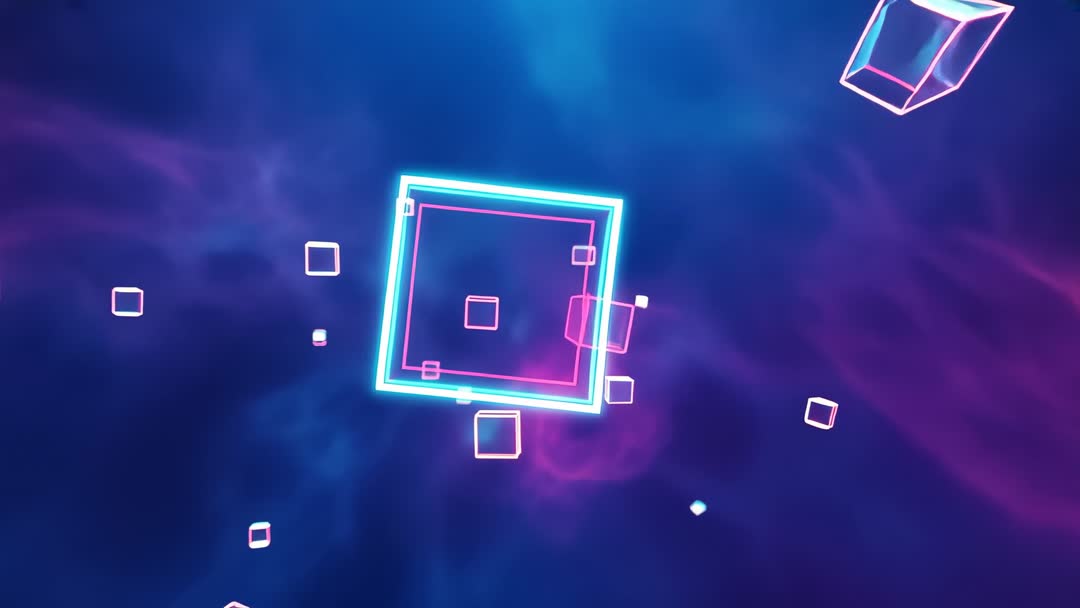 - Futuristic wireframe cubes rotating in cosmic blue and purple nebula