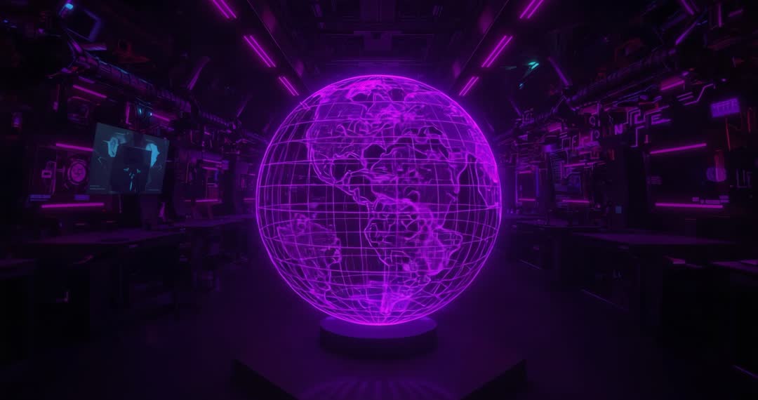 - Futuristic Wireframe Globe Rotating in High-Tech Command Hub