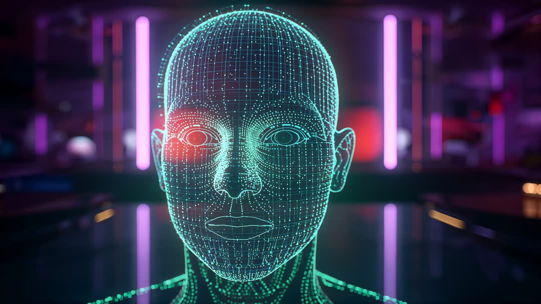 - Futuristic Wireframe Human Face in Vivid Cyberpunk Setting